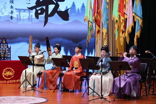 音乐会上,《来自唐朝的声影》艺术总监程天健教授介绍音乐会概况。 西安音乐学院西安鼓乐艺术团精彩演绎了旋律婉转悠长的《满园春》和《青天歌》、舞姿优美动人的《婆罗门引》和《步步娇》,筚篥独奏《雨霖铃》、清歌《鹊踏枝》《遐方怨》《诉衷情》《满庭芳》、坐乐曲联奏《将军令》《耍社火》《到春来》《霸王鞭》……乐曲风格既庄重高雅,又饱满热烈。