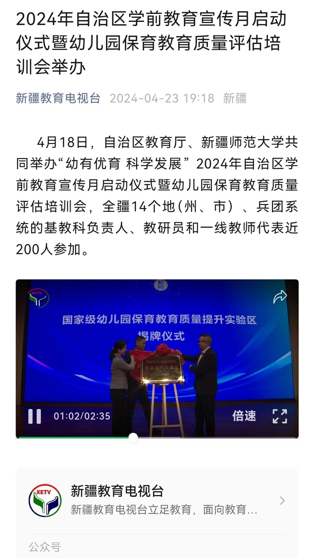 4月18日,自治区教育厅、太阳成集团tyc33455cc官网共同举办“幼有优育 科学发展”2024年自治区学前教育宣传月启动仪式暨幼儿园保育教育质量评估培训会,全疆14个地(州、市)、兵团系统的基教科负责人、教研员和一线教师代表近200人参加。