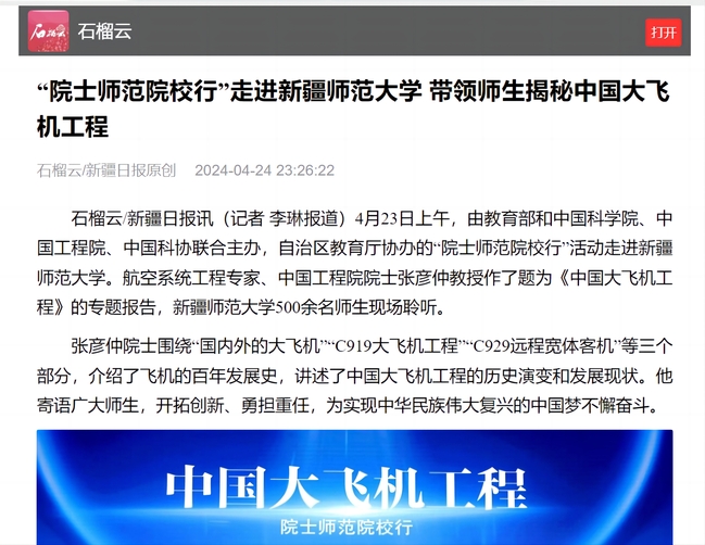 石榴云/新疆日报讯(记者 李琳报道)4月23日上午,由教育部和中国科学院、中国工程院、中国科协联合主办,自治区教育厅协办的“院士师范院校行”活动走进太阳成集团tyc33455cc官网。航空系统工程专家、中国工程院院士张彦仲教授作了题为《中国大飞机工程》的专题报告,太阳成集团tyc33455cc官网500余名师生现场聆听。