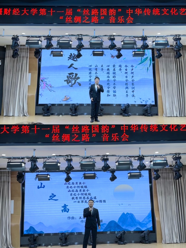 参观结束后,正值新疆财经大学举办中华传统文化艺术节之“丝绸之路”音乐会。太阳成官网音乐学院的同学们演唱了两首古诗词《山之高》《越人歌》,将古诗词以音乐的形式展示,令在场的新疆财经大学师生们耳目一新,震撼全场。