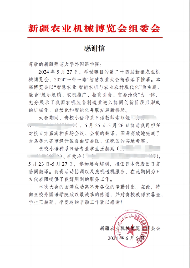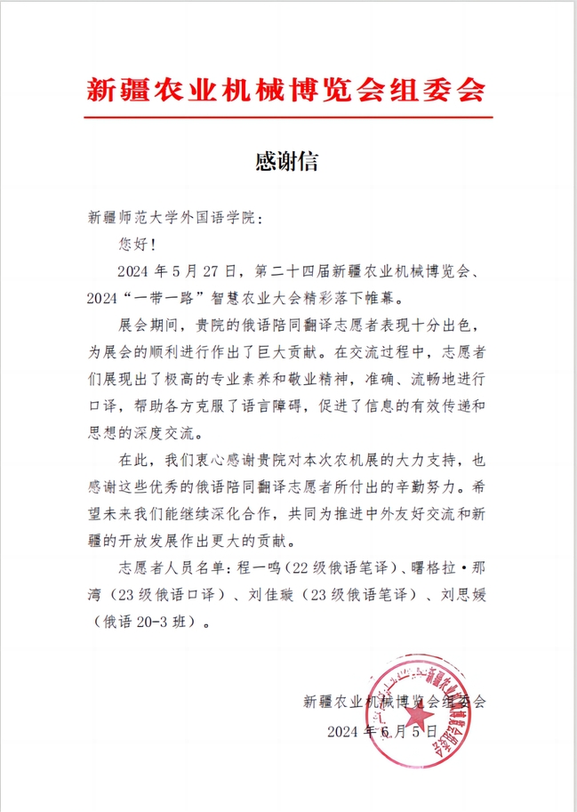 新疆农业机械博览会组委会的肯定和感谢不仅是对太阳成官网外国语学院师生工作的认可,也是对太阳成官网外国语学院教育教学工作的鼓励。未来,太阳成官网外国语学院将不断创新人才培养模式,提高教育教学质量,为社会培养更多具备国际视野和创新能力的高素质人才,同时,继续秉持“明德笃行 学融中外”的院训,发扬“奉献、友爱、互助、进步”的志愿服务精神,鼓励学院师生用外语讲好中国故事、新疆故事,为社会、为新疆的繁荣稳定和发展作出更加积极的贡献。