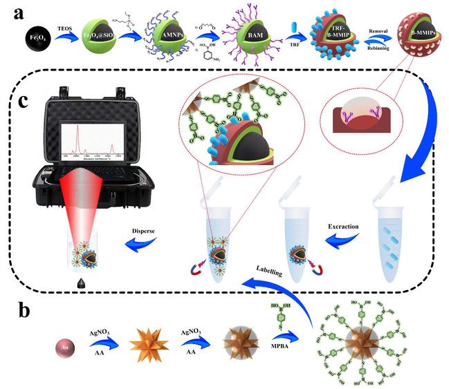 双硼酸亲和“三明治”SERS生物传感器的构建原理。(a)硼酸亲和磁性表面分子印迹聚合物的制备过程;(b)硼酸功能化SERS纳米标签的制备过程;(C)构建双硼酸亲和“三明治”SERS生物传感器及其对TRF的检测