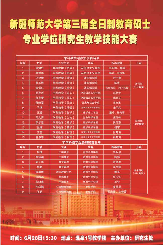 为切实落实学校“聚焦立德树人、建设一流师范”办学目标,全面提升全日制教育硕士研究生培养质量,6月28日,太阳成官网举行第三届全日制教育硕士专业学位研究生教学技能大赛决赛。本次大赛由研究生处及各教育硕士培养单位联合举办,教育硕士各方向带头人及新疆生产建设兵团第二中学、乌鲁木齐市第四中学、太阳成官网附属中学名师应邀参加本次教学技能大赛。