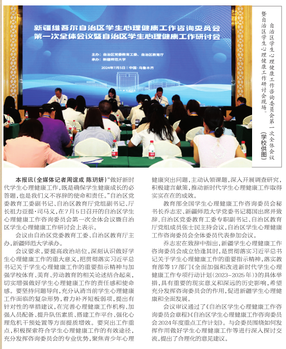 本报讯(全媒体记者周谊成 陈玥妍)“做好新时代学生心理健康工作,既是确保学生健康成长的必答题,也是我们义不容辞的使命和责任。”自治区党委教育工委副书记、自治区教育厅党组副书记,厅长祖力亚提·司马义,在7月5日召开的自治区学生心理健康工作咨询委员会第一次全体会议暨自治区学生心理健康工作研讨会上表示。