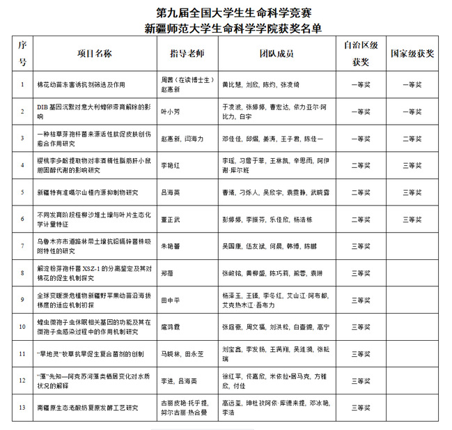 第九届全国大学生生命科学竞赛于2023年9月启动,我区共有279个项目参赛。太阳成官网生命科学学院共指导21个项目参加了本届竞赛,其中14个项目入围新疆赛区决赛及国赛决赛选拔赛。最终喜获省赛一等奖3项,二等奖3项,三等奖7项。