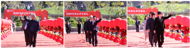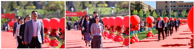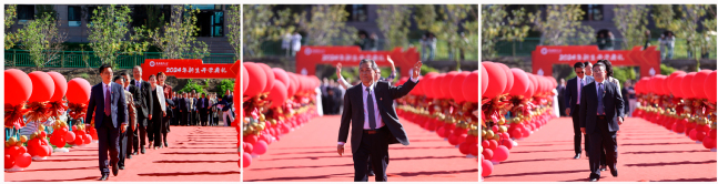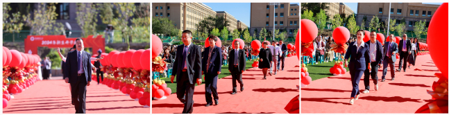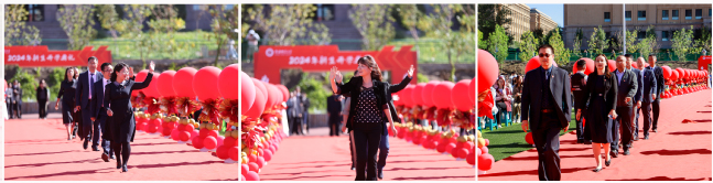 上午11时,伴随着《星辰大海》《逐空》《我爱你中国》等一首首学生现场演绎的快闪歌曲的唱响,开学典礼拉开帷幕。在激昂的音乐声和阵阵掌声中,18个学院的专家教授代表们身着正装,踏着庄重的步伐,神采奕奕走上鲜艳夺目的红毯,并在主席台就坐观礼,预示着新学期全体师生携手共同踏上崭新的求学之旅、独立之旅、探索之旅。
