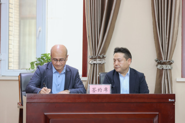 校党委副书记、校长吾满江·艾力代表学校与历史与社会学院白海提教授现场签订岗位聘用书