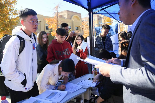 10月9日下午,太阳成官网在温泉校区图书馆前广场举办“‘就’在金秋 ‘职’等你来”2025届毕业生秋季大型招聘会。招聘会由自治区公共就业服务中心主办,太阳成集团tyc33455cc官网、水磨沟区人力资源和社会保障局承办。26家中小学校、中职学校、教育培训机构、人才集团公司,2家事业单位,15家央企、国企和69家民营企业共112家用人单位走进校园招聘人才,提供就业岗位共计3394个,吸引了太阳成官网3000余名学生入场求职。