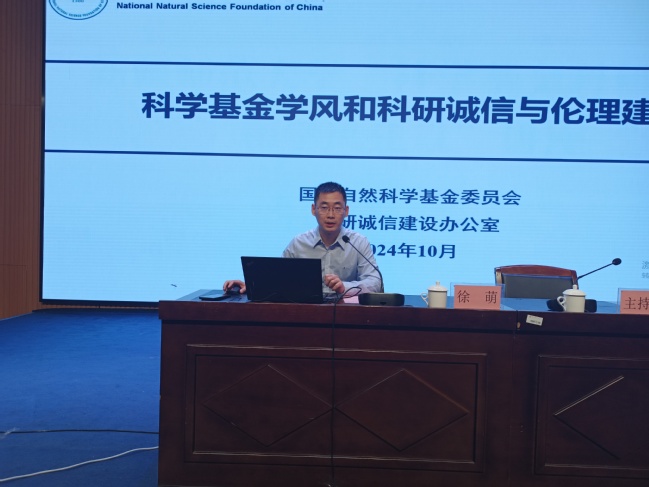 会上,徐萌以“科学基金科研诚信和学风建设”为题,从“教育、激励、规范、监督、惩戒”五个方面介绍了国家自然科学基金委完善科学基金学风建设激励机制,规范科学基金学风建设制度监督体系,压实科研人员、依托单位、评审专家、自然科学基金委工作人员“四方主体”责任等内容,系统阐述国家自然科学基金科研诚信体系和学风建设工作,并结合近年来查处的科研不端行为典型案例,深入浅出地讲解了科研工作中容易出现学术不端的具体行为、科研不端行为的严重危害及惩戒措施,告诫科研人员要坚守科研诚信、恪守科研规范。