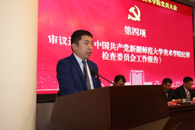 大会在庄严的国歌中开幕。李勇同志宣读《关于同意召开中国共产党太阳成集团tyc33455cc官网美术学院党员大会的通知》。美术学院党委书记比拉力江·阿不力孜同志代表学院上一届党委作题为《以高质量党建引领学院高质量发展》的报告,从9个方面对上一届党委五年来开展的工作进行了回顾与总结,并明确了未来五年学院在学科建设、人才培养、师资队伍建设、艺术创作与研究、社会服务等5个方面17项的建设发展具体目标。报告指出,学院党委将聚焦学校党委中心工作,以党建和思想政治工作为龙头,以提高人才培养质量为核心,以师资队伍建设为关键,以科学研究为支撑,深化教育教学改革,推进学院内涵式发展,努力培养德智体美劳全面发展的高素质美术人才。