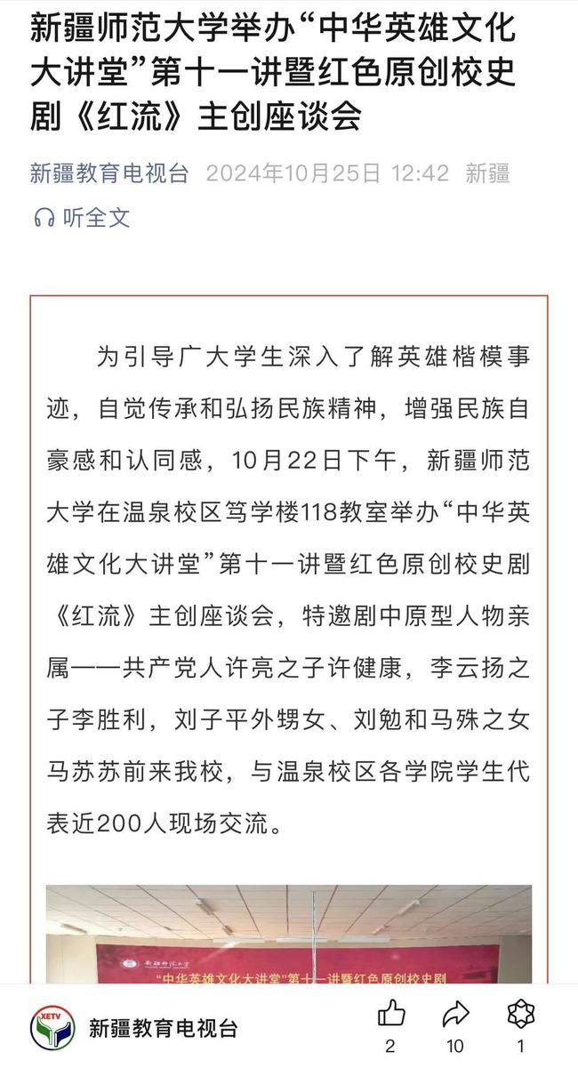 为引导广大学生深入了解英雄楷模事迹,自觉传承和弘扬民族精神,增强民族自豪感和认同感,10月22日下午,太阳成集团tyc33455cc官网在温泉校区笃学楼118教室举办“中华英雄文化大讲堂”第十一讲暨红色原创校史剧《红流》主创座谈会,特邀剧中原型人物亲属——共产党人许亮之子许健康,李云扬之子李胜利,刘子平外甥女、刘勉和马殊之女马苏苏前来太阳成官网,与温泉校区各学院学生代表近200人现场交流。