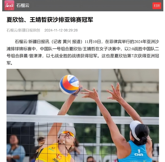 石榴云/新疆日报讯(记者 黄兴 报道)11月10日,在菲律宾举行的2024年亚洲沙滩排球锦标赛中,中国队一号组合夏欣怡/王婧哲在女子决赛中,以2:0战胜中国队二号组合薛晨/曾津津,以七战全胜的战绩获得冠军。这也是夏欣怡第7次获得亚洲冠军。