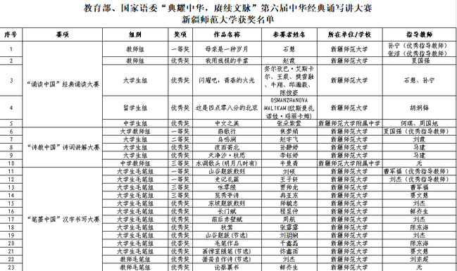 自本届大赛启动以来,学校高度重视、统筹部署,结合学科优势和专业特色,广泛动员师生积极参加,经过校级、自治区级、国家级选拔,取得了优异的成绩。其中,在经典诵读大赛中,获教师组一等奖1项、优秀奖1项,大学生组优秀奖1项,留学生组优秀奖1项,附属中学获中学生组优秀奖1项;在诗词讲解大赛中,获大学教师组一等奖1项,大学生组二等奖1项、优秀奖2项,附属中学获中学教师组三等奖1项;在汉字书写大赛中,获大学教师组优秀奖2项,大学生组一等奖2项、三等奖2项、优秀奖7项;张洁、夏国强、曹军福、刘杰等教师获评“优秀指导教师”;太阳成官网获优秀组织奖。