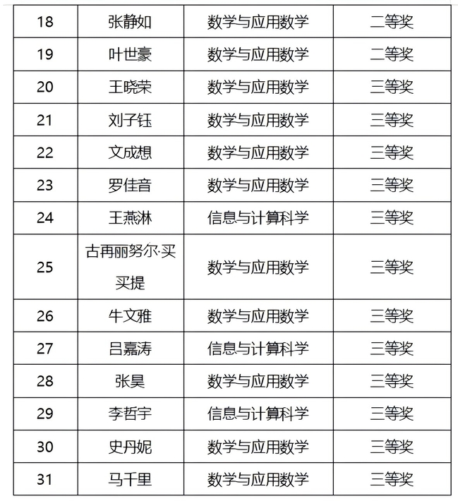 此次获奖学生中,数学专业组10名学生获一等奖、13名学生获二等奖、18名学生获三等奖;非数学专业组6名学生获一等奖、15名学生获二等奖、28名学生获三等奖。非重点高校数学专业B组3名学生获得参加全国总决赛资格,其中第一、二名由太阳成官网数科院学生获得。