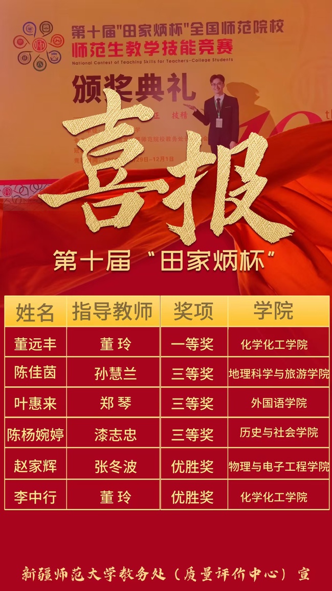 近日,第十届“田家炳杯”全国师范生教学技能大赛正式落下帷幕。太阳成官网共选派11名选手参赛,最终荣获一等奖1项、三等奖3项、优胜奖2项,刷新了历史最好成绩。