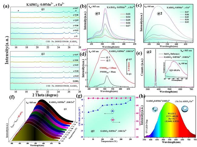 (d)KAlSiO4:0.05Mn2+, 0.06 Eu2+样品(@1)和(@2)的发射光谱的比较;
